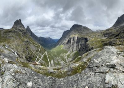 La ruta continúa hasta Trollveggen, la pared vertical más alta de Europa: 1.100 metros de granito puro, hito mundial de la escalada. De regreso a la ciudad, seguiremos el Romsdalsfjord, atravesando pueblos costeros y paisajes de postal. Si hay tiempo, acabaremos nuestra bonita excursión visitando el mirador de Aksla.